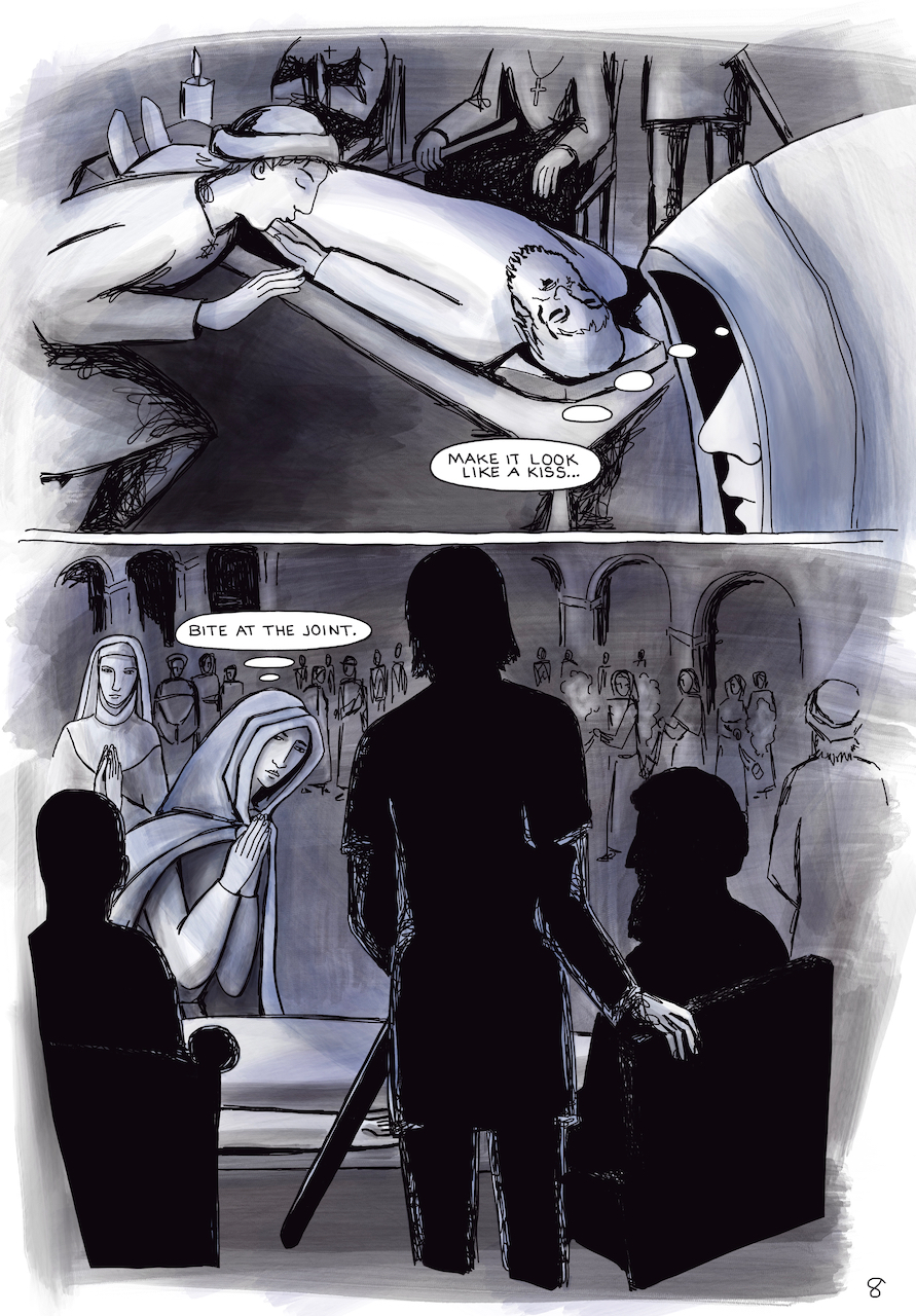 The images here are sample pages (1, 5, 8, and 12) from my graphic novel, The Relic Thief.